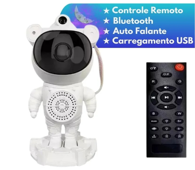 Quer dar vida ao seu ambiente de uma maneira única e mística? Apresentamos a Luminária Astronauta, a peça de decoração que vai encantar seus sentidos e iluminar sua imaginação. Esta luminosa extraordinária projeto um ceu estrelado em movimento, preenchendo o seu espaço com cores vibrantes e estrelas dançantes, criando a ilusão de uma galáxia a cada noite. Com um controle remoto intuitivo, você tem o poder de personalizar a sua experiência. Escolha entre três modos de iluminação diferentes para criar o ambiente projetado. Quer tornado Uma Noite Especial? Conecte-se via Bluetooth ao seu celular e deixe a música fluir pelos alto-falantes integrados. Veja para uma festa animada ou um momento romântico, a Luminária Astronauta é sua companhia perdida. Esta luminosa é mais do que apenas uma fonte de luz; é uma obra de arte que elevará a estética de qualquer espaço. Veja o quarto da criança, o seu proprio refúgio, o escritório criativo ou qualquer cômodo da sua casa, o astronauta adicia um jogo de mistério e aventura a qualquer ambiente. Ele é o complemento Perfeito para sua decoração, tornado seu espaço verdadeiramente único. Com a cabeça ajustável do astronauta, você pode direcionar as estrelas para onde querer. Crie padrões de luz personalizados, realçando os detalhes que mais gosta. Transforme sua sala em um observatório pessoal ou em um refúgio acolhedor, tudo com o toque de um botão. A Luminária Astronauta é mais do que apenas uma luminosa; é um portal para a imaginação. Com duas opções para ouvir música - via Bluetooth ou USB - e três modos de iluminação para escolher, você vai ter um controle completo sobre a atmosfera do seu espaço. Acessórios Inclusos na Embalagem: - 01x Astronauta Luminária Alto Falante - 01x Controle Remoto - 01x Cabo USB